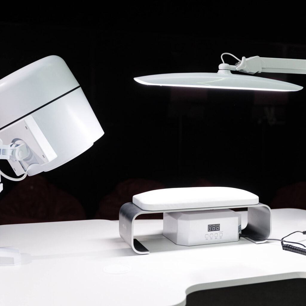 - Бестеневое освещение. Свет должен равномерно падать на руки клиента и рабочую зону, без контрастов. Оптимально, если источник создаёт эффект «заполняющего света» — без резких бликов.