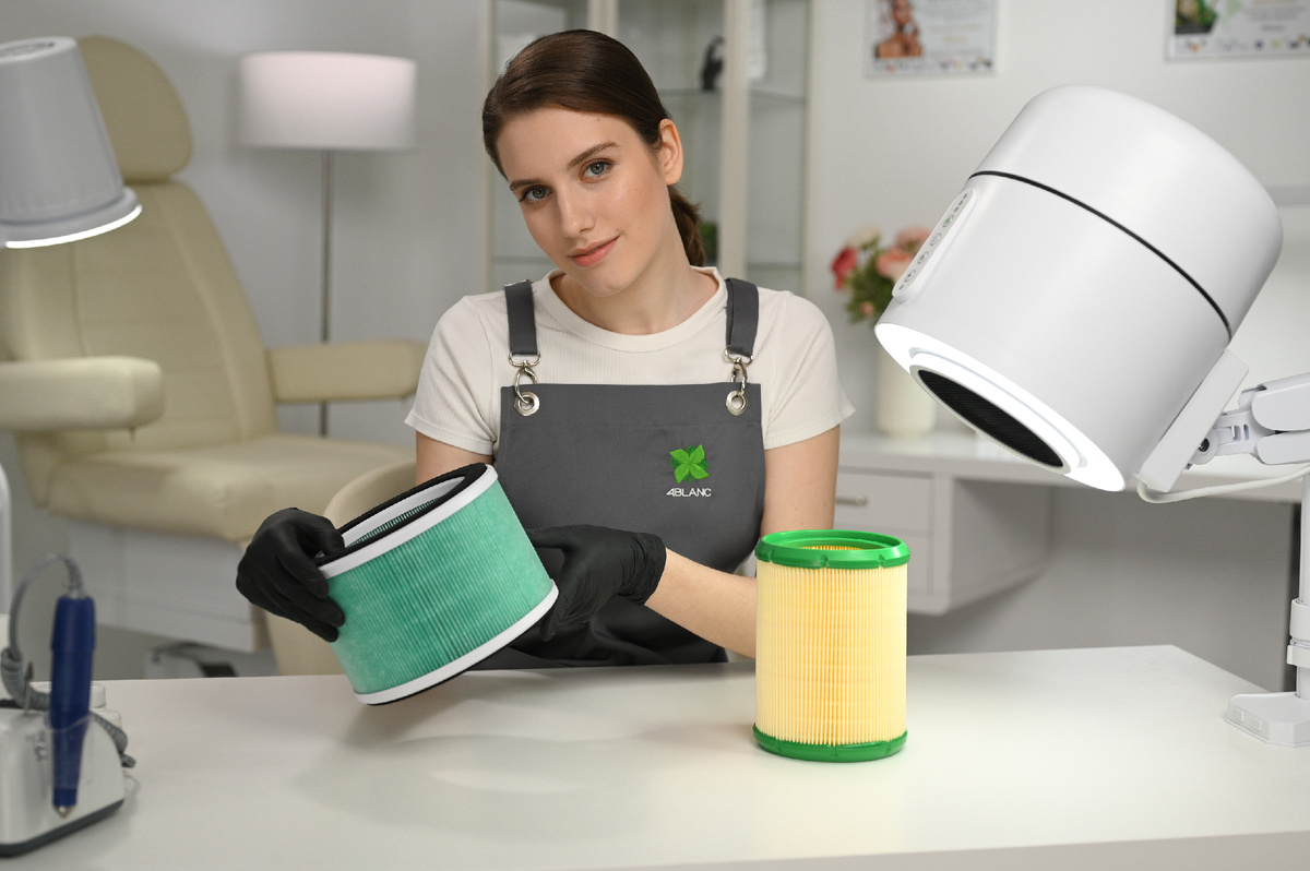 Идеальный вариант — вытяжка 4BLANC PRO с настольным креплением от 4BLANC. Она мощная, малошумная и удобная в установке. Сменные фильтры легко очищаются и при необходимости заменяются:
