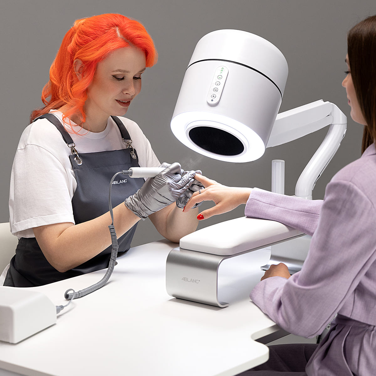 Продуманная геометрия делает подставку совместимой с большинством вытяжек и ламп 4BLANC, включая модель PRO, создавая эргономичное рабочее пространство и снижая нагрузку на спину мастера.