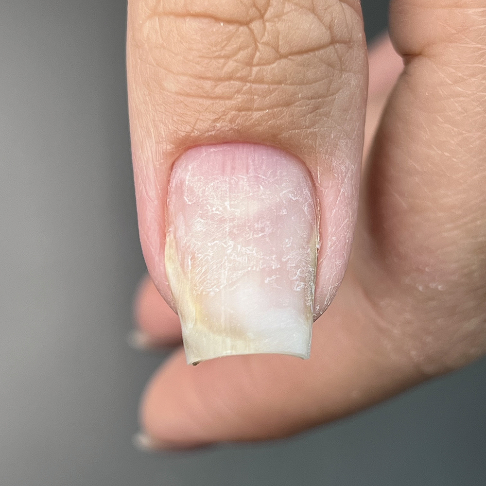Грибок ногтя — одна из частых причин возникновения отслойки (онихолизиса). Покрывать такие ногти нельзя, при подозрении на грибок, необходимо направить клиента к подологу и дерматологу.