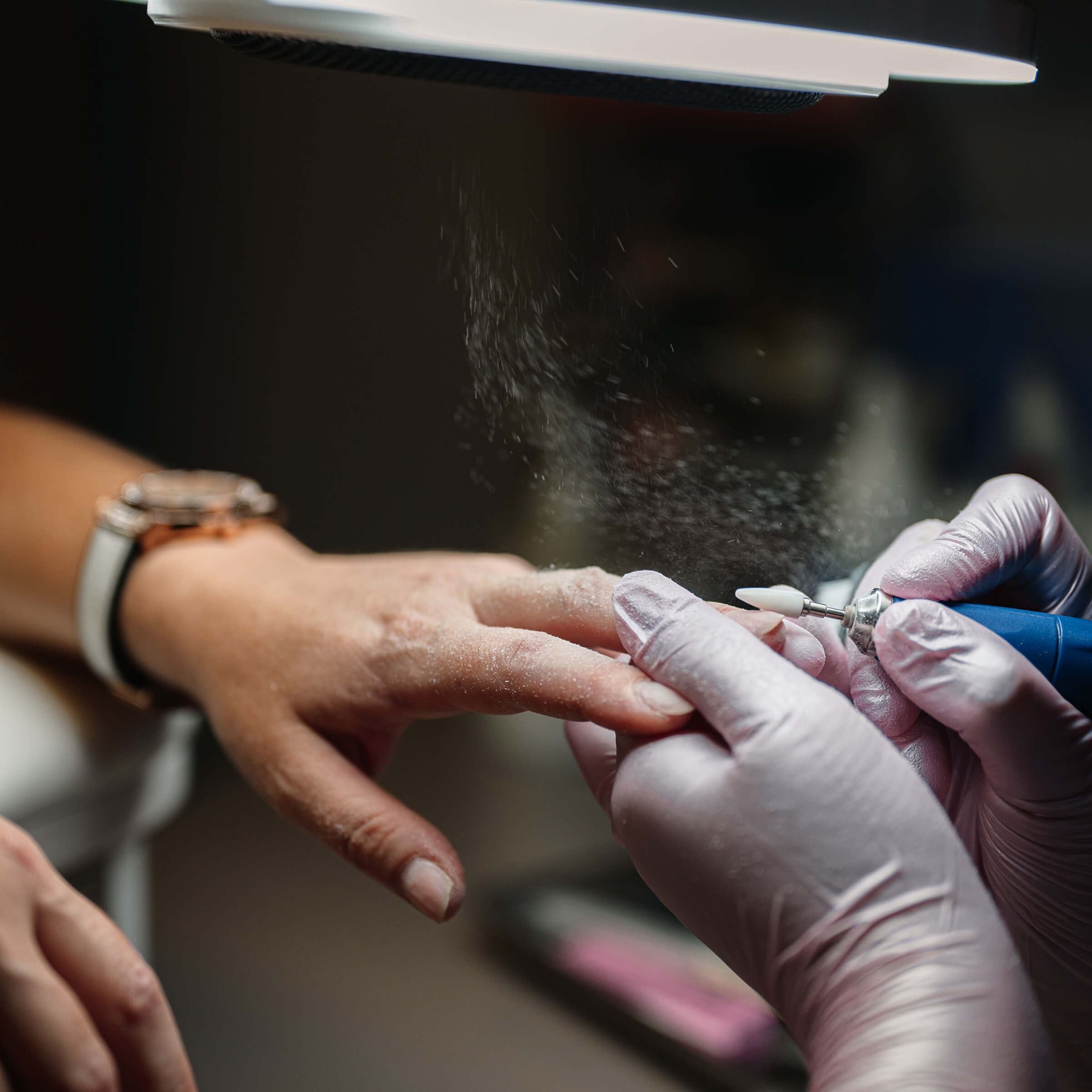 После снятия материала кожа контактирует с мелкой пылью. Если рабочее место не оборудовано вытяжкой, микрочастицы оседают на руках мастера и клиента, вызывая раздражения.